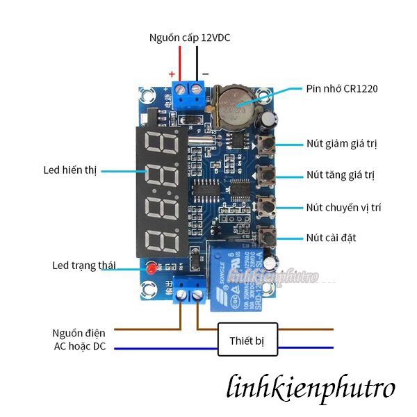 Mạch có 4 nút nhấn chức năng giúp điều chỉnh các thông số như tăng/giảm giá trị, chuyển vị trí, và cài đặt chế độ hẹn giờ. Đặc biệt, pin CR1220 giúp lưu trữ thời gian khi mất điện, đảm bảo hoạt động liên tục mà không cần thiết lập lại từ đầu. Ngoài ra, LED trạng thái báo hiệu tình trạng hoạt động của relay, giúp người dùng dễ dàng giám sát.