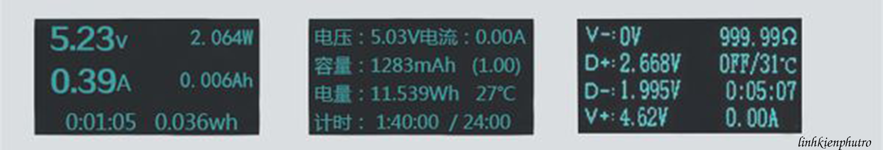 Hiển thị nhiều thông số: điện áp (V), dòng điện (A), công suất (W), dung lượng (mAh), nhiệt độ (°C), thời gian (h:m:s)